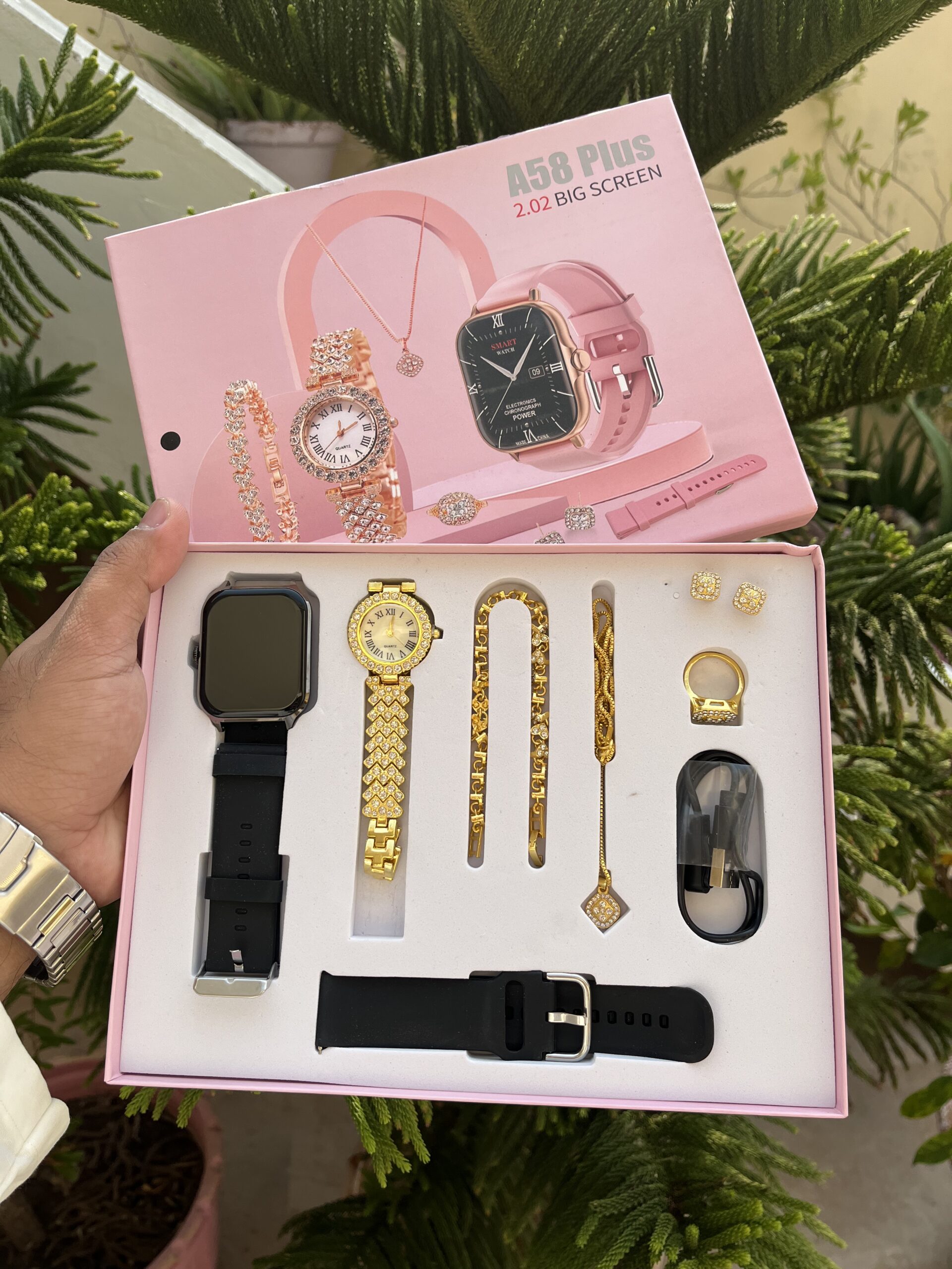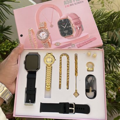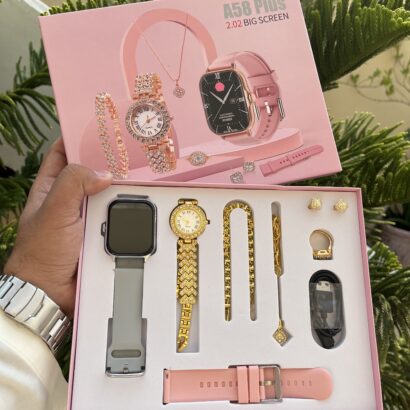 Elevate your style and stay connected with the A58 Plus Smartwatch Gift Set, designed exclusively for modern women who love fashion and functionality in one. This elegant 8-in-1 combo includes a smartwatch, quartz watch, heart bracelet, crystal jewelry, and more — beautifully packed in a luxurious gift box.